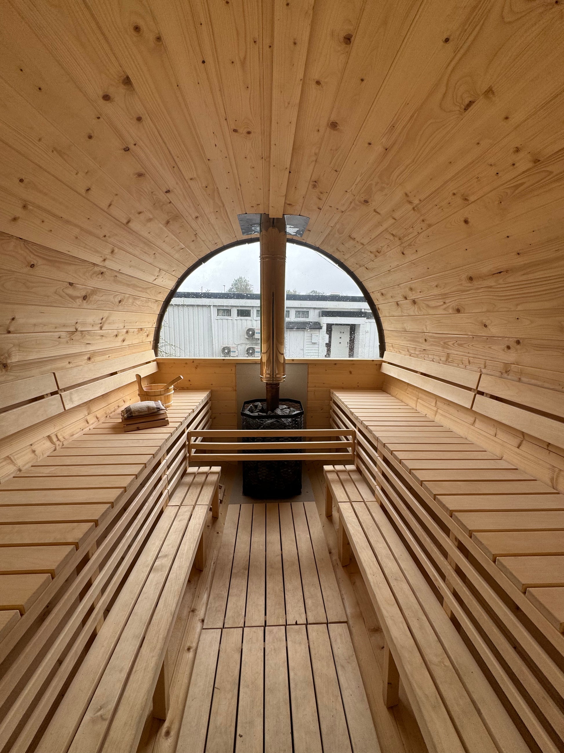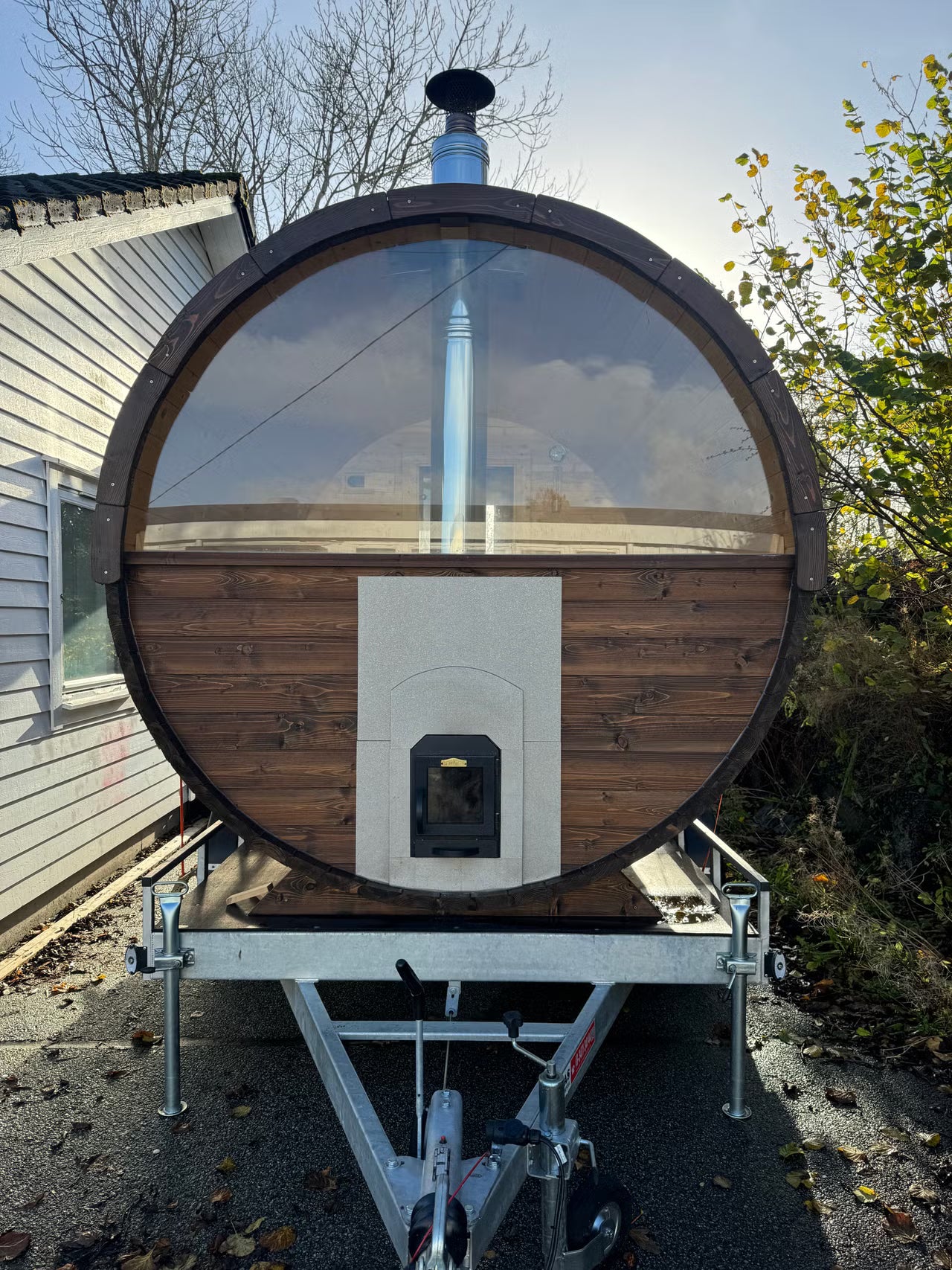 Solid tønnebadstue på tilhenger, total lengde 4 meter – med 1 meter omkledningsrom og 3 meter badstue. Diameter 2,3 meter gir god plass til opptil 8 personer.
