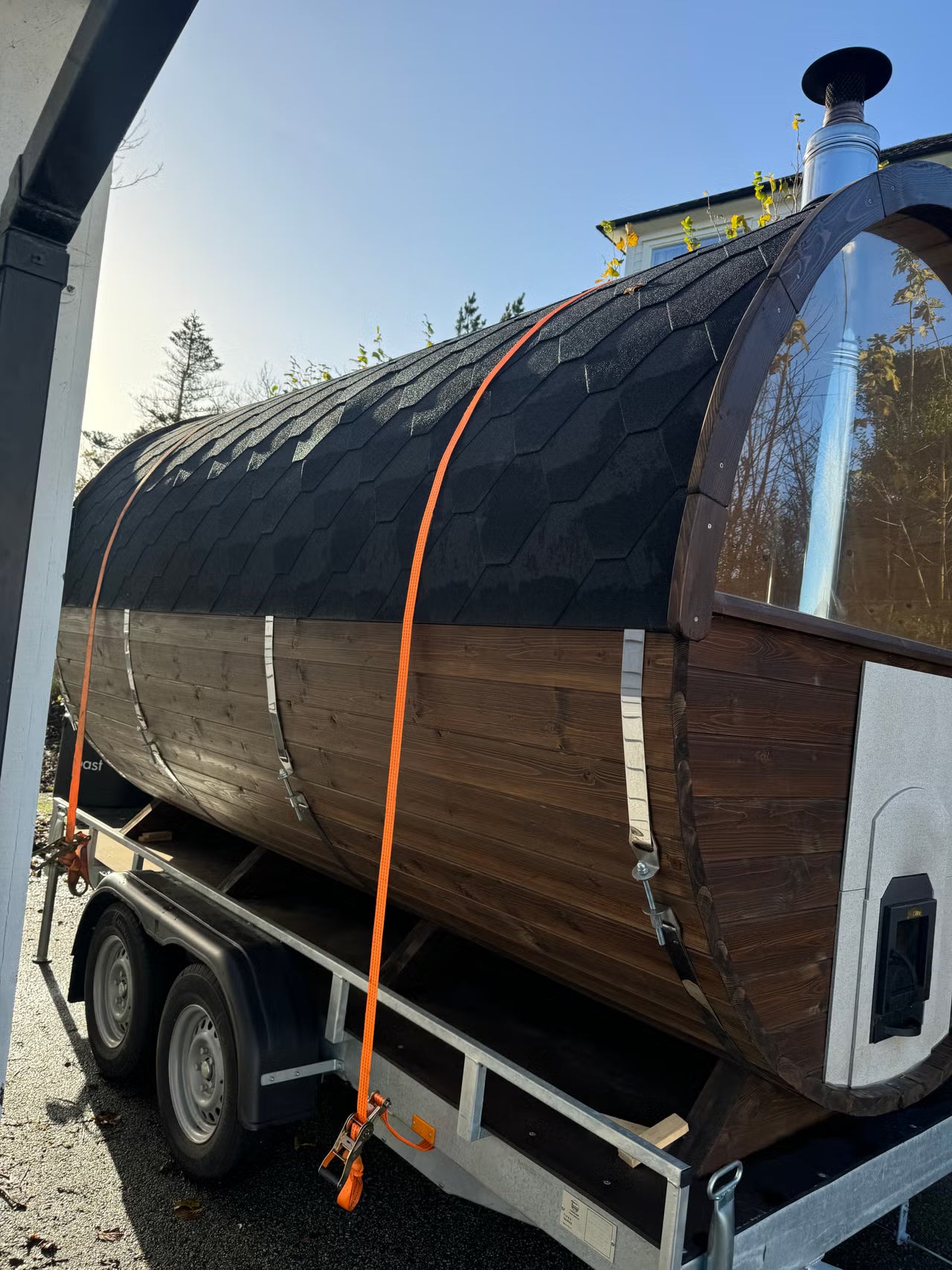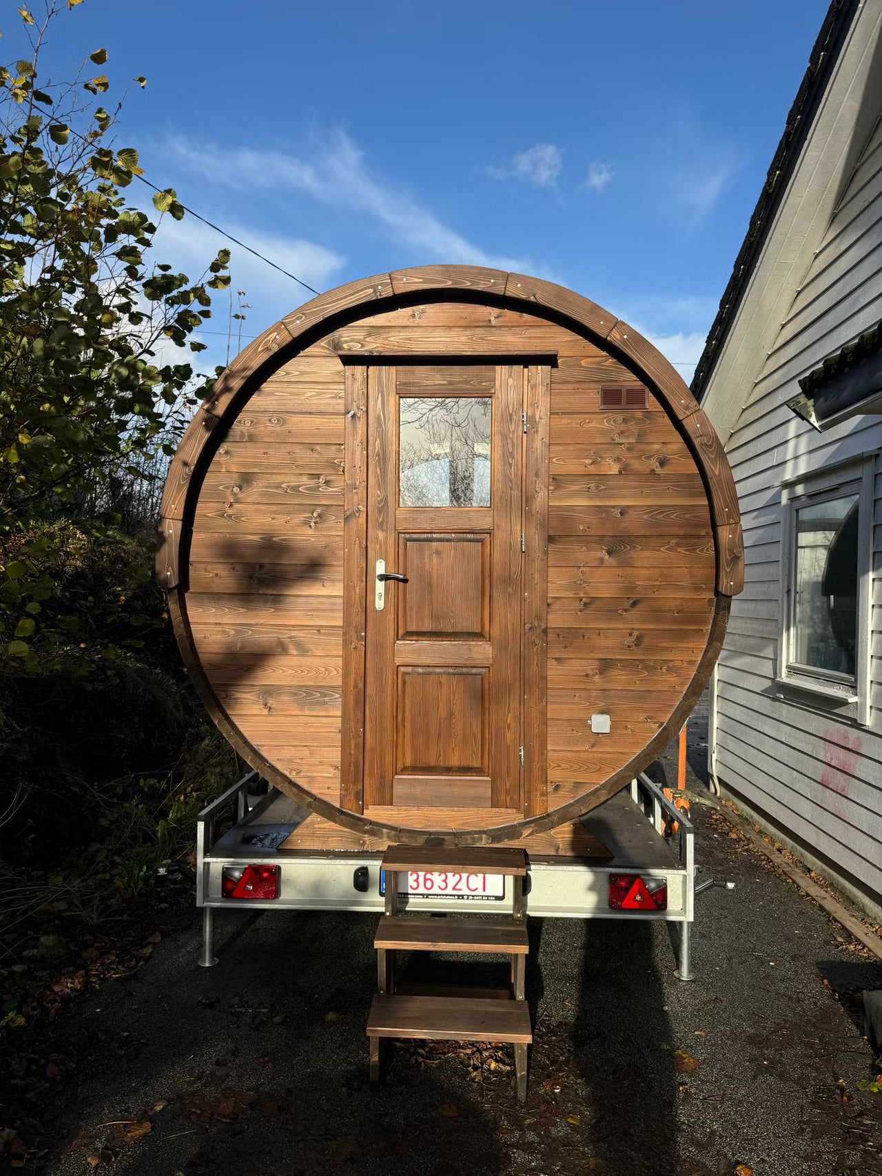 Solid tønnebadstue på tilhenger, total lengde 4 meter – med 1 meter omkledningsrom og 3 meter badstue. Diameter 2,3 meter gir god plass til opptil 8 personer.