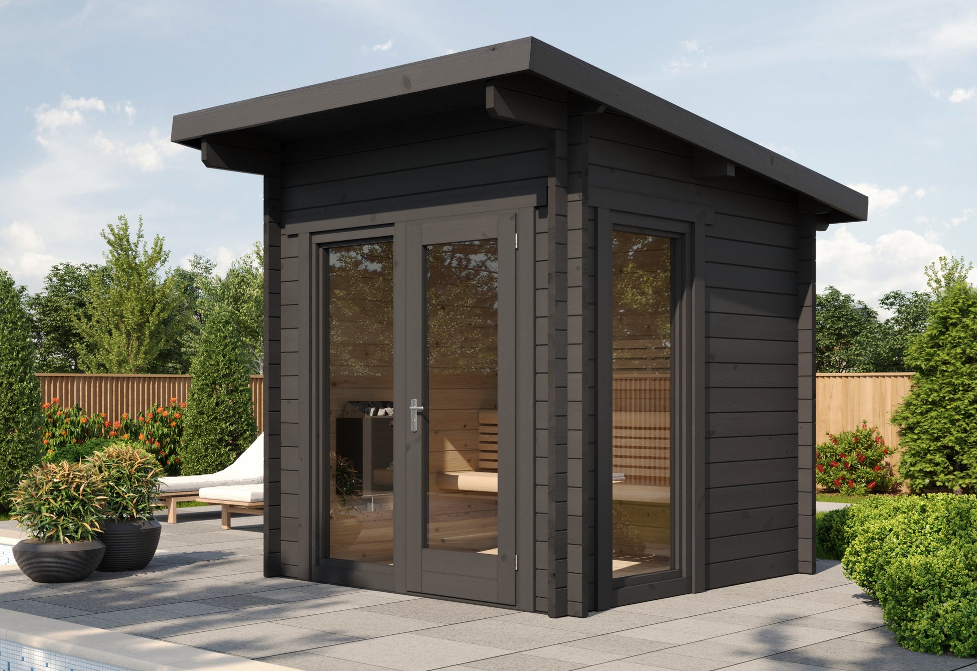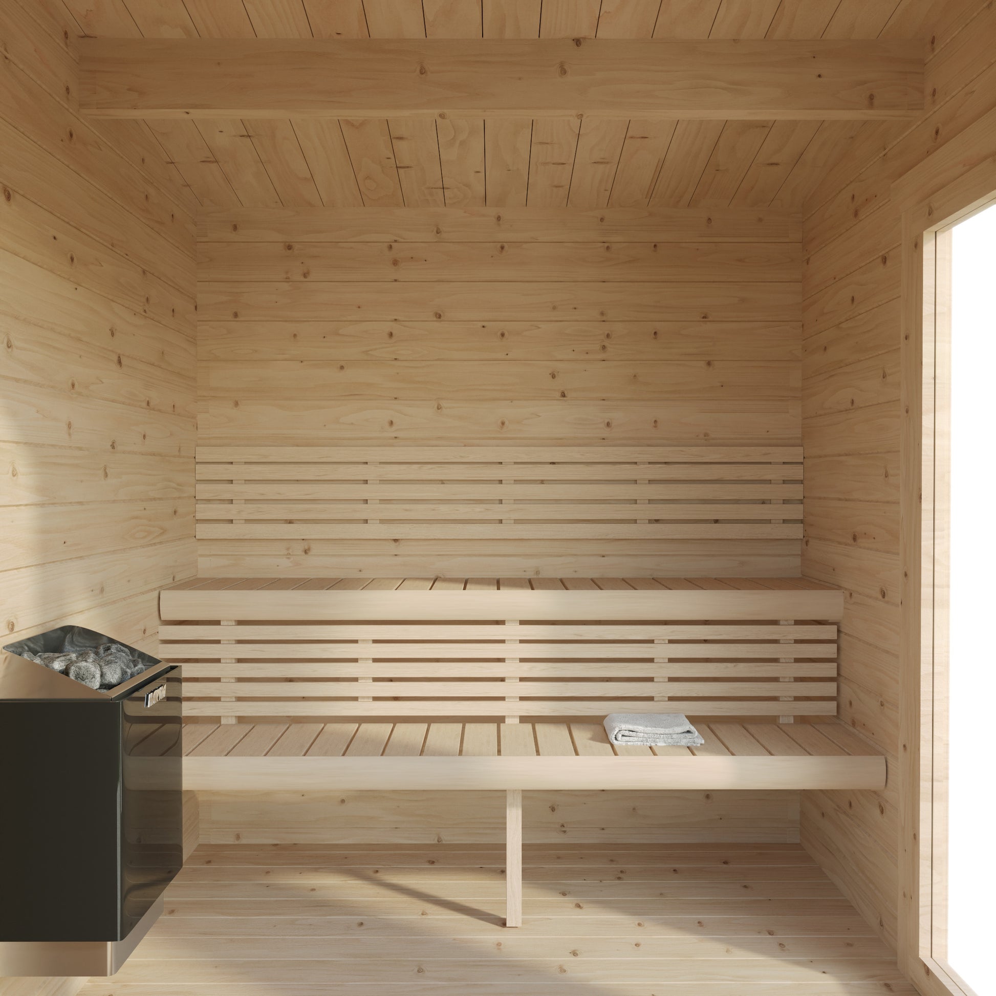 Anita Hytte er en romslig og gjennomført badstu bygget i solid gran med 45mm tykke vegger. De store panoramavinduene slipper inn lyset og gir en luftig, åpen følelse — enten du plasserer den i hagen, ved sjøen eller på hytta.