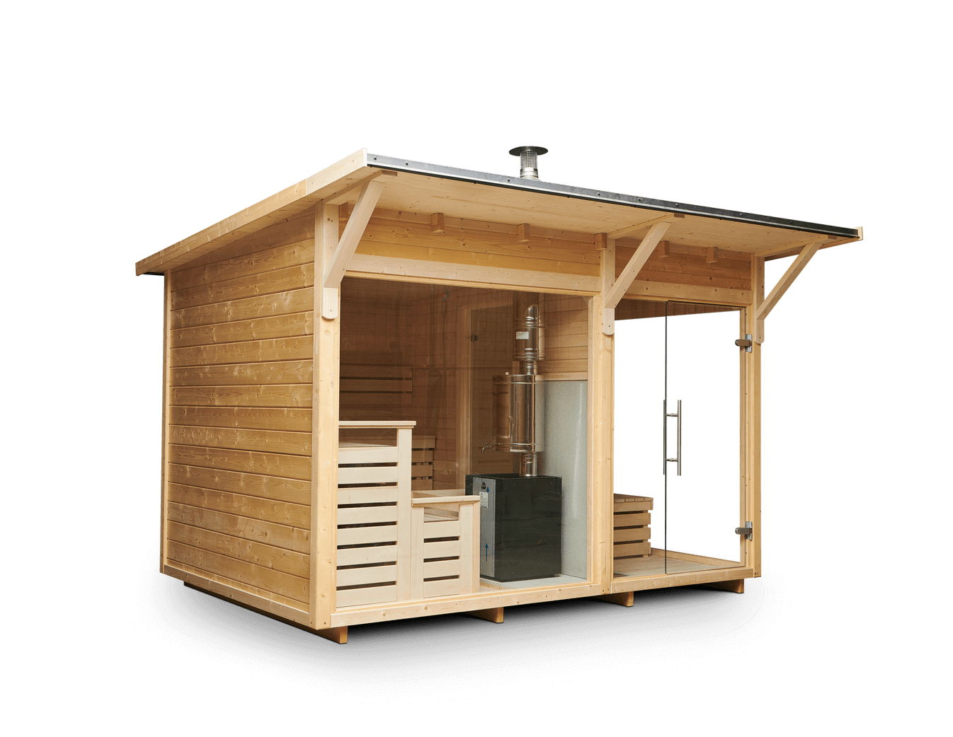 Prisen inkluderer benker, bord og gulvrist i tre, to panoramavinduer (2000 x 2000 mm og 700 x 1900 mm) med 8 mm herdet glass, samt en glassdør. Vegger og tak er i 42 mm massiv gran, behandlet med Sikkens-maling og sinkbelagt tak.