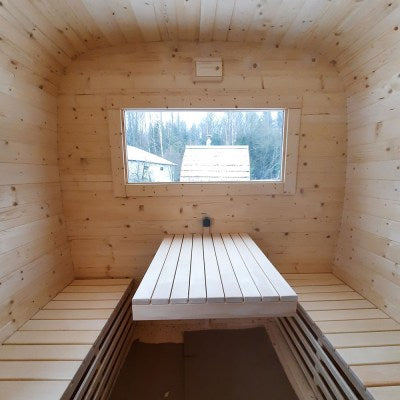 Fjordkube er en moderne og stilren badstue, perfekt for både hage og hytte. Med sitt kubiske design skaper den en romslig og komfortabel badstuopplevelse, samtidig som den tar minimalt med plass.